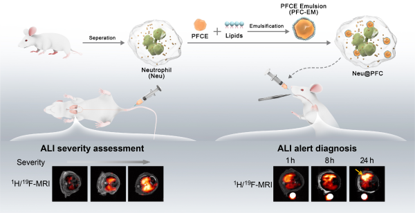 中性粒细胞是参与ALI发生发展的重要效应细胞,可以迅速响应炎症刺激,通过趋化反应跨越多道生理屏障抵达炎症部位。基于中性粒细胞的纳米载体递送策略在ALI诊断的临床应用中具有潜力。该研究构建了自趋化的活细胞19F-MRI示踪剂。这一示踪剂将中性粒细胞摄取全氟化碳纳米乳(Neu@PFC),靶向肺部炎症组织。全氟化碳纳米乳几乎不影响中性粒细胞的形态、活力、表面蛋白标志物和趋化性等。研究显示,在脂多糖诱导的ALI小鼠模型中,经气管递送Neu@PFC,通过肺部19F-MRI实时监测可实现ALI的预警诊断。同时,研究发现,经静脉注射Neu@PFC,在血液循环中受趋化因子浓度梯度的引导靶向迁移至肺炎组织,利用19F-MRI可以勾画炎症区域,定量评估ALI的严重程度。