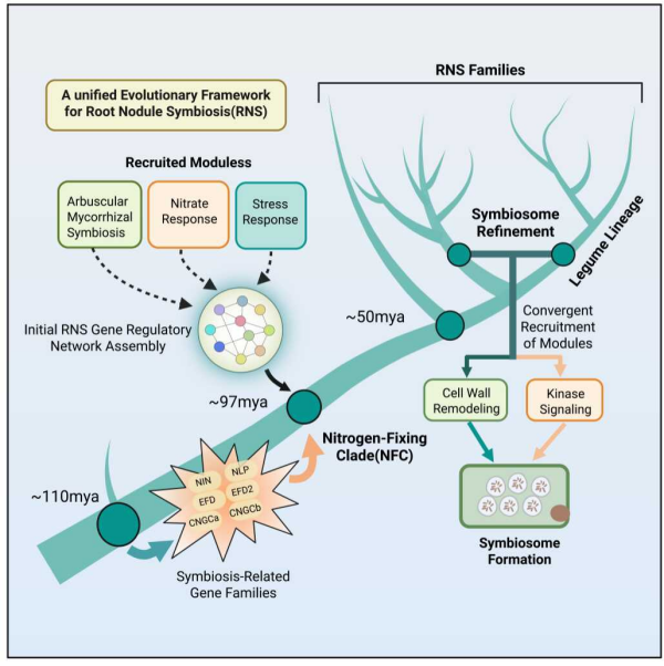 研究明确根瘤共生初始调控网络(含523个基因)起源于固氮支系的共同祖先,该网络通过模块化招募策略,整合重排菌根共生、硝酸盐响应、胁迫响应三大通路的基因构建而成。