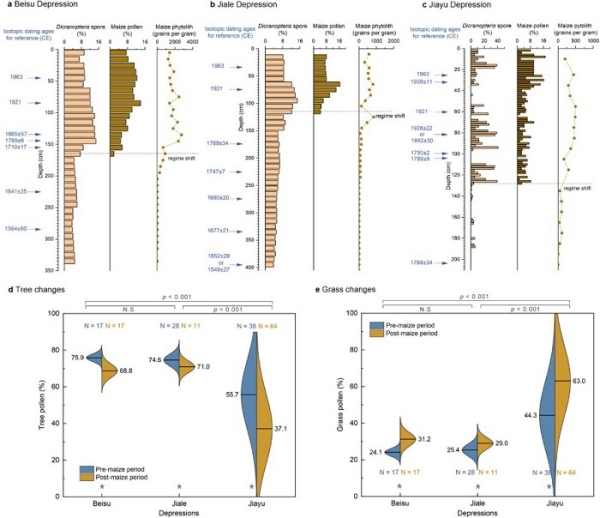研究表明,18世纪玉米孢粉和玉米植硅体的首次出现在三个洼地中高度同步,并伴随着先锋蕨类孢子显著增加,同时乔木花粉比例明显下降、草本花粉比例上升。其中,重度石漠化洼地的树—草比例变化最为剧烈,清晰指示出玉米引种及随之而来的开垦活动是区域石漠化的重要触发因素。