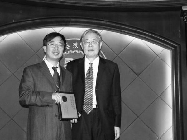 2005年,潘建伟与周光召(右)在“求是杰出凯发k8家奖”颁奖典礼上。潘建伟供图