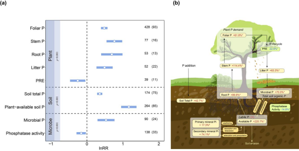 研究揭示了磷添加背景下,全球陆地生态系统磷循环和磷动态的变化及其调控机制,深化了对陆地生态系统磷动态、磷限制与生物地球化学耦合的机理认识,为将磷循环纳入陆地生物圈模型,共同预测未来全球变化背景下陆地生态系统养分循环、生态系统生产力等的变化提供了理论基础。